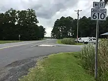 Maryland Route 610 (MD 610) is a state highway in the U.S. state of Maryland. Known for most of its length as Whaleyville Road, the state highway runs 6.53 miles (10.51 km) from the county-maintained portion of Dale Road near Whaleyville north to U.S. Route 113 (US 113) near Bishop. The first segment of MD 610 was constructed near Whaleyville in the mid-1930s. The highway to Bishop was brought into the state highway system in the 1940s. MD 610, which did not originally reach US 50, was extended south to that highway, now MD 346, in 1955. The state highway reached its current southern terminus after the US 50 divided highway was constructed in the mid-1960s.