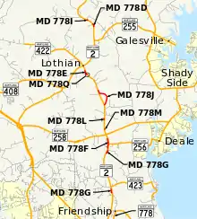 - MD 778F is a 0.48-mile (0.77 km) loop located on the southbound side of MD 2 in Tracys Landing, with termini on either side of MD 2's intersection with MD 256 (Deale Road).[1][20] This highway was bypassed between 1957 and 1960.[13][14]