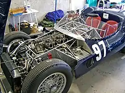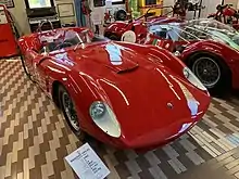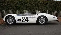 The Maserati Tipo 60/61 (commonly referred to as the Maserati Birdcage) are a series of sports racing cars produced between 1959 and 1961 by Italian automobile manufacturer Maserati for privateers racing in sports car events including the 24 Hours of Le Mans in the 2-litre and 3-litre racing category.[2] It used an intricate tubular space frame chassis, containing about 200 chro-moly steel tubes welded together, arranged triangular formation at high stress areas of the chassis, hence the nickname "Birdcage".[1] This method of construction provided a more rigid and, at the same time, lighter chassis than other racing cars of the time.[1]