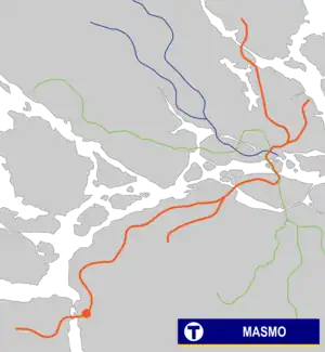 Masmo metro station is a station on the red line of the Stockholm metro, located in Masmo, Vårby, Huddinge Municipality. The station was opened on 1 October 1972 as part of the extension from Vårberg to Fittja.[2] It was the first of the "grottstations" (cave-stations).[3] The distance to Slussen is 16.1 km (10.0 mi).