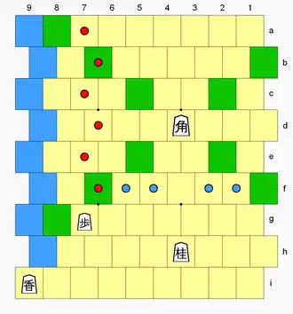 The bishop (4d) moves in four directions along board diagonals (to any green-colored cell). It is restricted to one third of the board before promotion. The lance (9i) moves forward only, in alternating cant directions (any blue-colored cell). The knight (4h) has four move options (blue dots) and moves in the pattern: one step forward on a cant, then one step forward diagonally. As in shogi, the knight leaps any intervening men. The pawn (7g) moves forward in the same pattern as the lance (red dots), but one step at a time.