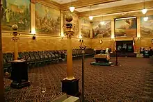Former meeting room of Delaware Lodge 46 in the Muncie Masonic Temple, one of two lodge rooms on the top floor. Each room features 11 unique murals painted by artist Gustave Brand (c. 1922), depicting scenes from the Old and New Testaments of the Bible. The murals remain today.