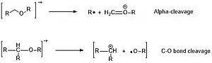 Ethers produce slightly more intense molecular ion peaks compared to the corresponding alcohols or alkanes. There are two common cleavage modes. α-cleavage and C-O bond cleavage.