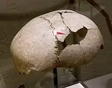 In the course of the excavations, which covered about 20 percent of the site, the skeletons of about 200 individuals were discovered in the outer trench, most of whom died as a result of severe injuries to their skulls caused by blunt force (with shoe-last celts), and in one case also by arrow shot. The trenches remained open for some time, so that the position of some corpses was altered by animals. The dead - men, women and children - had mostly been laid in prone position, in many examined skeletons arms or legs were missing, also severed skulls were found separately. It was remarkable that there were hardly any young women among the dead.[3] Probably all inhabitants were killed or captured during an attack on the settlement; after that the settlement area was no longer inhabited.