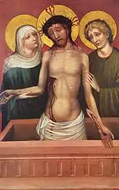 The Master collaborated with the Master of the Imhoff Altar in the creation of the eponymous altarpiece; his depiction of the Man of Sorrows with the Virgin and Saint John forms the reverse panel. This is a characteristic example of his solemn and simple style. Another, more restrained work is the Man of Sorrows Standing with the Virgin, today in the Germanisches Nationalmuseum.
