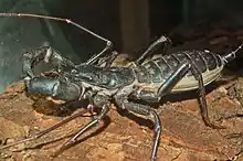 Mastigoproctus giganteus lives in the southern US and in Mexico at elevations up to 6000 feet.[4] It preys on various insects, worms, and slugs.[7] It is an efficient predator that feeds at night on a variety of Arthropods, primarily insects such as cockroaches and crickets, as well as millipedes and other arachnids. It has even been recorded feeding on small frogs and toads. It uses its large pedipalps to hold prey, while the chelicerae tear and bite the prey.[8]