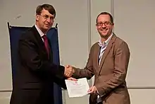 ![]() Matthew Owens (right) receiving the Fowler medal in 2012 | |