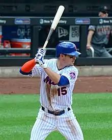 Reynolds spent the 2015 regular season in Triple-A before being called up to the Mets during the 2015 NLDS to replace the injured Rubén Tejada.[8] In doing so, he became the first player in modern baseball history to be added to a postseason roster in the middle of a series without previous major-league experience. He also became the third player in modern baseball history to be included on a postseason roster without previous major-league experience, after Chet Trail (of the New York Yankees in the 1964 World Series (not on the active roster)) and Mark Kiger (of the Oakland Athletics in the 2006 American League Championship Series).[9][10] He was dropped from the roster for the World Series, and did not appear in any games in the playoffs.[11]