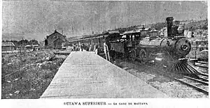 In the 19th century, Mattawa became a hub for the logging industry, which would harvest large untouched stands of white pine in the area and use the Mattawa River to transport logs to sawmills. In 1881, the railroad was built to Mattawa.[3] It was mostly built by French Canadian labourers. After the railroad's completion, some of these labourers and their families settled in Mattawa (and surrounding areas), bringing with them their culture and heritage.[8]