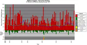 A graph showing Hoggard's test career bowling statistics and how they have varied over time.