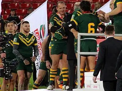 In 2011, Scott was appointed as the co-captain of the Cowboys, sharing the position with Johnathan Thurston, who had previously held it alone.[15] He was also named the NRL's prop of the year in the Dally M Awards after missing out in 2010.[16] His performance in Game 1 of the 2011 State of Origin series won him plaudits, with Brisbane newspaper The Courier Mail calling his "impact and workrate... enormous",[17] and ABC Sport praising his "powerhouse display up front".[18] He and fellow Queensland prop Petero Civoniceva ran the ball for a total of 301 metres during the match; their New South Wales counterparts only managed 71.[19] Queensland won the match and went on to win the Origin series. The Cowboys returned to the NRL finals series, finishing in seventh place, and Scott was selected in the Australian squad to tour England for the Four Nations series.[20] He scored the first try of the tournament, in Australia's 26–12 win over New Zealand; it was his first try as an international.[21] During the tournament, the annual RLIF Awards dinner was held at the Tower of London and he was named prop forward of the year.[22]