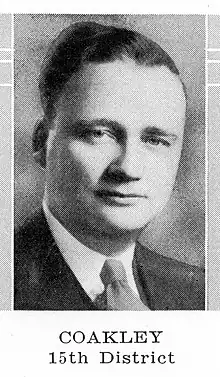 In 1934 Coakley won a plurality in a five-way Republican primary contest for the Senate seat won the year before by Democrat Alexander Paul. In the general election he was successful in unseating Paul, with 8847 votes to 8076 for Paul and 6168 for Progressive George Geffs. He was assigned to the standing committee on the judiciary.[1] He was unchallenged in the 1938 primary, and easily won re-election against Progressive Joseph Sweeney.[2]