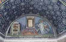 Mosaics composed of glass tesserae cover the interior walls of the vault, the lunettes and the cupola; the adornments are of high quality.[1] Above the entrance portal is a mosaic depicting Christ as the Good Shepherd among his flock.[1] The barrel-vaults of the four arms of the cruciform chapel bear vegetal mosaics consisting of acanthus and vine scrolls.[1] In the western arm's lunette a mosaic represents deer approaching a spring, perhaps a reference to Psalm 42, whose incipit is "As the hart panteth after the water brooks, so panteth my soul after thee, O God."[1] In the southern transept's lunette is a mosaic depicting a male saint carrying a cross accompanied by a burning gridiron and an opened cabinet containing the four canonical Gospels, identified by the names of the Four Evangelists in Latin.[1] Unidentified figures of white-robed martyrs decorate the lunettes of the east and west transepts.[7] The interior of the dome at the centre is decorated as a starry sky, with a regular mosaic of golden stars on a dark blue background, with a gold cross represented at the apex of the dome and the four symbols of the Evangelists (or the "living creatures" of Revelation 4:7) at the corner pendentives.[1] The four lunettes below the dome, between the arches springing from the four central piers and the arches of the pendentives above them, have mosaics each depicting two Apostles with their right arms raised in acclamation likely directed at the male saint in the southern transept's mosaic.[1]