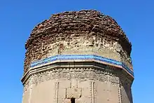 Decorative elements include a blue and turquoise glazed ceramic tile trim that is still visible along the upper portion of the tower, just below the base of the dome and above an inscription. Below the tile trim is some decorative molding, while a frieze in bas-relief encircles the top portion of the funerary tower is inscribed in Arabic and begins with a famous sura from the Quran. It then goes on to commemorate Emir Pir-Hussein, the son of Sa'ad. The inscription says:[2]