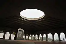 The current mausoleum is 3.6 meters tall, 48 meters in circumference, and is surrounded by a brick wall. On the south side stands a Ming dynasty stone stele that reads "Qiao Mountain Dragon Rider" (橋山龍馭), a reference to the story of the Yellow Emperor and his family riding into the west on a golden dragon.[2] The eastern side's stele hallway preserves 57 Imperial stele commissioned by various emperors. On the western side stand returned commemoration stele from Hong Kong and Macao.