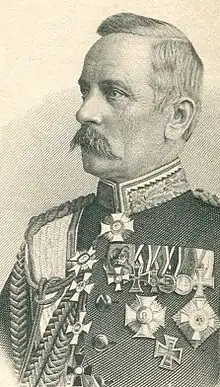 From 10 May 1892 to 15 April 1901 he was Minister of War of Württemberg. During his tenure, among other things, he established the military training area in Münsingen. On 18 April 1896, Schott von Schottenstein was promoted to General of the Infantry by King William II. After Hermann von Mittnacht's resignation as head of government,[5] Schott von Schottenstein became Prime Minister of Württemberg, in addition to his work as Minister of War, serving from 10 November 1900 to 15 April 1901.[6] During this time he was also President of the Privy Council.[7] Only a few months in office as Prime Minister,[8][9] Schott von Schottenstein had to resign from his ministerial posts because he had compromised himself as a witness in a pandering trial.[lower-alpha 1][10]