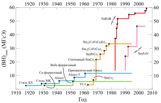 During the 20th century, the maximum energy product of commercially available magnetic materials rose from around 1 MGOe (e.g. in KS Steel) to over 50 MGOe (in neodymium magnets).[4] Other important permanent magnet properties include the remanence (Br) and coercivity (Hc); these quantities are also determined from the saturation loop and are related to the maximum energy product, though not directly.