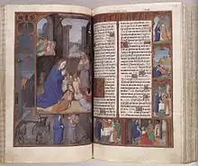 The manuscript belongs to a small group of very luxurious illuminated manuscripts produced in Flanders (probably Bruges or Ghent) during the early 16th century. It contains around 80 miniatures, including 36 full-page miniatures.[1][6] These were done by more than 12 different artists. The Master of the First Prayer Book of Maximilian was the leading artist, supported by five other members of the same workshop. Miniatures are also credited to Gerard David, the Master of James IV of Scotland and others.[1]