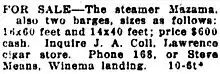 On March 13, 1919, the steamer Mazama was advertised for sale, together with two barges, one 16 by 60 feet, the other 14 by 40 feet, for a total price of $600.[20] Mazama was dismantled at some time, after which the hulk lay in the tule reeds for years.[21]