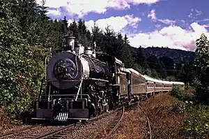 No. 19 was built by the Baldwin Locomotive Works in April 1915 as Caddo and Choctaw Railroad No. 4. It was Baldwin's 42,000th locomotive produced.[1] The locomotive was also christened with the name of R.L Rowan; an engineer on the railroad.[1] In the early 1920s, No. 4 was sold to the Choctaw River Lumber Company while still retaining her No. 4. The engine worked in Arkansas until 1920, when the locomotive was sold off to the United States Smelting, Refining and Mining Company, based out of Boston, Massachusetts.[1] The engine was then sent to Pachuca, Mexico, a silver rich region northeast of Mexico City.[1] The locomotive was repainted and re-lettered "Cia de Real del Monte y Pachuca" as their No. 105. Around the time that the engine was sent to Mexico, it was apparently converted to burn oil instead of coal.[1] It was also while the engine was in Mexico that it got its nickname, Pancho. Legend goes that No. 19 had a run in with Mexican revolutionary, Pancho Villa, hence, her nickname was born.[2] After a four-year stint in Mexico, No. 105 was again sold to the McCloud River Railroad in Northern California, which renumbered it to No.19 as they had an identical locomotive to No. 19, No. 18. It was also revealed that when the crews in McCloud, California, were fixing and repainting the locomotive in 1920, bullet holes were discovered in the locomotive's cab and exterior.[3] The engine worked in regular service on the McCloud River Railroad until purchased by the Yreka Western Railroad three decades later in 1958.[4][5]