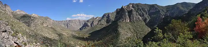 Farther up the canyon, the path becomes quite steep as it begins to follow a series of switchbacks, climbing nearly 2,000 feet (610 m) over the next 2 miles (3.2 km), eventually reaching "the Notch" at an altitude around 7,200 feet (2,200 m).[2][5] From this high point, one can view McKittrick Canyon and the distant desert to the east and South McKittrick Canyon to the west.