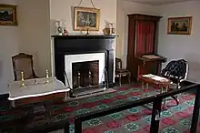 The McLean House was originally constructed by Charles Raine in 1848.[5] Eliza D. Raine's estate sold the house to Wilmer McLean in 1863. It had formerly been a tavern (not to be confused with the nearby Clover Hill Tavern, which Raine had previously owned). One of the first battles of the American Civil War took place on the farm of Wilmer McLean at the Bull Run tributary, the First Battle of Bull Run (First Battle of Manassas). Soon after that battle the McLeans, seeking to avoid the war, moved to the village of Clover Hill, Virginia (the name of which was changed to "Appomattox Court House," having just become the county seat). Because of the name of the village, many mistakenly think the surrender was signed in the courthouse building. (In years past, the county seats of many rural counties, especially in Virginia, had names that were simply the name of the county plus "Court House"; some of these remain today.)[6] The courthouse is about 3 miles (5 km) from the Appomattox Station where the trains came into Appomattox, Virginia.[7]
