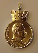 The Medal for Heroic Deeds was instituted in Norway by royal resolution on 19 August 1885 and is awarded for honorable actions in saving lives or a comparable act. There were originally three classes, but from 1905 the medal has only been awarded in gold and silver.[1] To be awarded in gold the recipient must have committed an unusually notable rescue of life where the rescuer's life was put at risk. The medal is surmounted by the Crown of Norway and the adverse side features the portrait, name and title of the reigning monarch. At present the portrait is of King Harald V of Norway, and the inscription reads «Harald den 5, Norges Konge» (Harald the fifth, King of Norway). The reverse features an oak wreath and the words «For edel dåd» (For noble deed). The ribbon is in the national colours of Norway: red, white and blue.