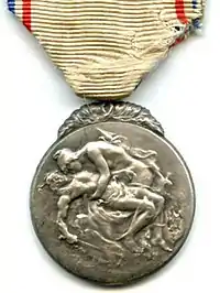 The Medal of French Gratitude (French: "Médaille de la Reconnaissance française") was a French honour medal created on 13 July 1917 and solely awarded to civilians.[1] The medal was created to express gratitude by the French government to all those who, without legal or military obligation, had come to the aid of the injured, disabled, refugees, or who had performed an act of exceptional dedication in the presence of the enemy during the First World War. The creation of this distinction was mainly the result of unsuccessful offensives of General Nivelle in 1917 and the serious crisis of confidence in France. The French government thus wanted to thank those who, despite the crisis, were always volunteering. It has three classes: bronze, silver, and gold. Nearly 15,000 people and communities were recipients of this award. The medal is no longer awarded, the last award was on 14 February 1959.[2]
