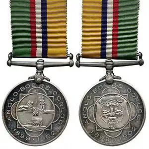 The Medalje voor de Anglo-Boere Oorlog is a South African military campaign medal. It was instituted on 21 December 1920 as a retrospective award for Boer veteran officers and men who fought in the 1899–1902 Second Boer War.[1][2][3][4]