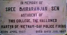 Student politics is rooted in tradition, with many students participating in the Indian freedom struggle.[3] Anti-British movements were implemented with the programmes of Bengal Provincial Students' Federation (BPSF),[3] the Bengal branch of All India Students' Federation. Student politics was initially focused on the independence of India.[3] In 1947, Sree Dhiraranjan Sen, a student of the college, died during a Vietnam Day police firing.[4] The Vietnam Students’ Association passed a resolution in its Hanoi session in memory of Sen in March 1947.[5]