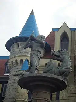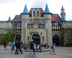 The section is entered through a fortresses' walls, over a castle moat.[2] The front facade of Wonderland Theatre, previously Canterbury Theatre, was designed as a castle, and the other buildings were designed to fit the same time period.