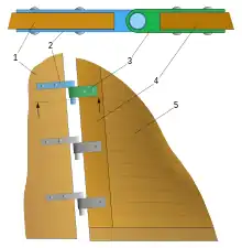 A type of heavy wheeled plough commonly found in Northern Europe.[5] The device consisted of four major parts. The first part was a coulter at the bottom of the plough.[6] This knife was used to vertically cut into the top sod to allow for the plowshare to work.[6] The plowshare was the second pair of knives which cut the sod horizontally, detaching it from the ground below.[6] The third part was the moldboard, which curled the sod outward.[6] The fourth part of the device was the team of eight oxen guided by the farmer.[7] This type of plough eliminated the need for cross-plowing by turning over the furrow instead of merely pushing it outward.[7] This type of wheeled plough made seed placement more consistent throughout the farm as the blade could be locked in at a certain level relative to the wheels. A disadvantage to this type of plough was its poor maneuverability. Since this equipment was large and led by a small herd of oxen, turning the plough was difficult and time-consuming. This caused many farmers to turn away from traditional square fields and adopt a longer, more rectangular field to ensure maximum efficiency.[8]