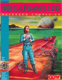 GDW first published the space opera role-playing game Traveller in 1977, and many adventures and supplements followed. Ten years later, in an attempt to revitalize the franchise, GDW revised the rules and published it as MegaTraveller. One of the first supplements to be published was the MegaTraveller Referee's Companion,[2] a 98-page softcover book by Marc W. Miller with contributions by Frank Chadwick, Joe D. Fugate Sr., and Gary L. Thomas, interior art by Rob Caswell, Liz Danforth, Jeff Dee, A.C. Farley, Bryan Gibson, and Tom Peters, cover art by Jim Holloway, and published by GDW in 1988.[3]