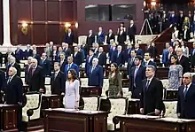 In Azerbaijan's fraudulent 2005 parliamentary elections, she was elected to the National Assembly of Azerbaijan. Her candidacy was run by the New Azerbaijan Party from the Azizbeyov Second Constituency №14, and she was elected to the Parliament with 92.12% of the votes.[3] She had previously broken with tradition to help campaign for her husband in 2003, when he ran for President of Azerbaijan.[17] The Sunday Times, writing in 2005 about Aliyeva's decision to run for the Azerbaijani parliament, described her as already wielding "considerable influence," and the Heydar Aliyev Foundation as "a powerful and wealthy institution set up to safeguard the late president’s legacy and support a number of educational and charitable projects."[6] She was nominated from Khazar Constituency №14 in 2010 and 2015 parliamentary elections and gained 94.49% of the votes in 2010, 96.7% in 2015.[3]