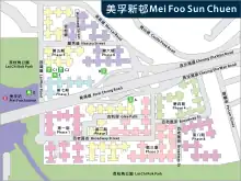 Mei Foo Sun Chuen or simply Mei Foo is a large private housing estate in Lai Chi Kok, Kowloon, Hong Kong. Mei Foo Sun Chuen was the first large scale private housing estate in Hong Kong and at the time of completion, the 99-tower complex was considered the largest private housing development in the world,[1] accommodating some 70,000 – 80,000 people in 13,500 apartments.[1] It is considered to be one of the world's largest privately financed residential condominium projects.[1]