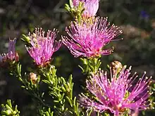 The flowers are arranged in heads at the ends of branches, with the branch continuing to grow after flowering. Each head has 1 to 4 groups of flowers in pairs or threes. The stamens are arranged in five bundles around each flower, 6 to 12 stamens per bundle, coloured pink, purple or magenta. Flowering occurs in September and October and the fruit which follow are woody capsules 4.8–6.5 mm (0.2–0.3 in) long.[2][3]