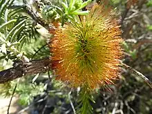 The flowers are arranged in cylindrical spikes that are 40–50 mm (1.6–2.0 in) long and wide. The spikes occur on old wood and there are 40 to 60 flowers on each spike. The stamens are arranged in five bundles around the flowers with 4 to 5 stamens per bundle, and are usually green in the centre grading to red at the tips. Flowering occurs over an extended period from July to October. The fruit are woody capsules in dense spikes 40–50 mm (1.6–2.0 in) along the stem long and each capsule is 4–5 mm (0.16–0.20 in) long and wide.[2][3]