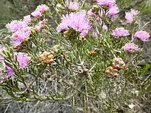 The flowers are a shade of pink to purple and are arranged in heads on the ends of branches which continue to grow after flowering, sometimes also in the upper leaf axils. The heads are up to 18 mm (0.7 in) in diameter and contain 5 to 12 groups of flowers in threes. The petals are 0.7–1.5 mm (0.03–0.06 in) long and fall off as the flower ages. The stamens are arranged in bundles of five around the flower, usually with 4 to 6 stamens in each bundle. The flowering season is mainly in spring but has been recorded as early as April. The fruit are woody capsules, 2–3 mm (0.08–0.1 in) long forming roughly spherical clusters around the stem.[2][3]