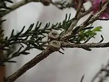 This species flowers profusely with deep pink flowers in clusters along the stems. The clusters contain between 4 and 15 individual flowers and are up to 12 mm (0.5 in) in diameter. The petals are 1.2–2.3 mm (0.05–0.09 in) long and fall off soon after the flower opens. The stamens are arranged in five bundles around the flower, each bundle containing 4 to 12 stamens. Flowering occurs in early spring and is followed by the fruit which are woody capsules 2.6–3 mm (0.10–0.12 in) long in loose clusters along the stem.[2][3]