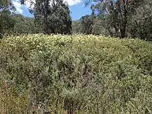 Melaleuca pityoides, commonly known as alpine bottlebrush,[2] is a plant in the family Myrtaceae, and is endemic to the higher areas of south eastern Australia. Some Australian state herbaria continue to use the name Callistemon pityoides.[3] It is a shrub, often occurring in dense thickets, with hard bark, silvery-grey new growth, almost cylindrical leaves and spikes of flowers that are usually a shade of yellow.