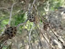 The flowers are yellow to white and arranged in heads or short spikes on the sides of the branches. Each head contains 4 to 13 groups of flowers in threes and is up to 15–17 mm (0.6–0.7 in) in diameter. The petals are 0.9–2 mm (0.04–0.08 in) long and fall off as the flower matures. There are five bundles of stamens around the flower, each with 3 to 7 stamens. Flowering occurs between August and October and is followed by fruit which are woody capsules, 1.8–2.2 mm (0.07–0.09 in) long in tight, almost spherical clusters.[2][3]