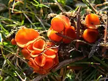 This European species appears all year as smooth, dull orange-red disks up to 15 mm in diameter on damp sandy soil.