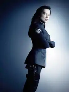 Melinda May is brought on to the recently resurrected S.H.I.E.L.D. agent Phil Coulson's team as pilot and field agent, to investigate superhumans and other related phenomena.[3] She is shown to be in a relationship with fellow agent Grant Ward.[4] Coulson tells agent Skye that May, during a mission in Bahrain in 2008, single-handedly took out a superhuman threat and several accomplices, saving a team of S.H.I.E.L.D. agents, though a young girl was killed in the crossfire. Left traumatized by the experience, May withdrew from field duty. Later, her trauma is shown to be gradually healing.[5] She also ends her relationship with Ward. Unknown to Skye and Coulson, May is monitoring their conversation, and reporting to someone else.[6] When the Hydra Uprising begins, May reveals that she knew the truth about Coulson's resurrection[lower-alpha 1] and was monitoring him on director Nick Fury's orders, and Coulson refuses to trust her any more.[9] Feeling unwanted, she leaves, searching to find out the truth behind Coulson's resurrection.[1] She finds the truth and brings it back to Coulson.[10] May later incapacitates Ward, who was a double agent for Hydra, and after Ward's mentor John Garrett's death, goes with the team to the Playground to help restart S.H.I.E.L.D., under the newly promoted director Coulson.[11]