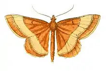 Upper Side. Antennae setaceous and yellow. Thorax and abdomen yellow. Wings deep straw-coloured, the anterior having a small black spot placed near the middle of the anterior edges. A small narrow line of a silverish colour runs along the external edges of these wings, beginning near the tips, and continuing along the edges of the posterior ones, ends at the abdominal corners.
