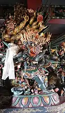 The chorten is decorated with richly carved annexes facing the four directions, and contain mandalas, statues and a shrine dedicated to the third king.[2] The ground floor of the chorten is consecrated to the teachings of Vajrakīlaya. It has four shrines, each with different pictures of the king; with the eastern shrine housing a Buddha image. From the ground floor, a staircase leads to two more floors and each floor has four shrines. A centrally placed large wooden carving covers all three levels, behind the shrines; a large number of wooden carvings mostly depict wrathful looking protective deities. The roof of chorten is accessed from the second level and a protective railing covers the terrace on the third floor.[2][4] The second floor is dedicated to teachings of the Drukpa Lineage of the Kagyu school to subdue eight varieties of evil spirits and the top floor is dedicated to the teachings of Lama Gongdü (Wylie: bla ma dgongs 'dus). Combined, these three floors form the esoteric teachings of the Nyingmapa sect.[1] All of the texts were once hidden by Padmasambhava and were rediscovered by tertöns in the 19th, 12th and 14th centuries respectively.[1] The top floor has paintings depicting various deities of the Nyingma school, and visions which appear in the bardo. Above the top floor there is a gallery, which can be walked around the circumference of the chorten and which has views of the city.[1]