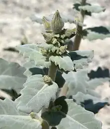 Mentzelia leucophylla is a biennial or perennial herb growing up to 0.5 metres (1.6 ft) tall. The stem and herbage are coated in tiny white hairs, making them pale and velvety.