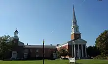 Notable features of the church on North Meridian Street are its Georgian-Colonial-style architecture, pipe organ, and formal parlor. The two-story church, a smaller chapel to the south, and a two-story wing that connects the church to the chapel were built in the early 1950s; the Aldersgate addition on the building's west side, at the rear of the church, was built in 1988–89. The red-brick exterior has wood trim that is painted white. The church's front facade, which faces east toward Meridian Street, includes a two-story portico with four columns. A 150-foot (46 m) steeple was erected at the front edge of the church's gable roof. A domed cupola rests atop the chapel's gable roof, above its front entrance.[16]