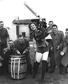 British film actress Rona Anderson demonstrates her cricket skills to players of the 1949 New Zealand cricket team touring England during a visit to Pinewood Studios. Left to right: Martin Donnelly (kneeling), Geoff Rabone, Walter Hadlee (kneeling), Frank Mooney, Rona Anderson, Harry Cave, Merv Wallace, John Reid
