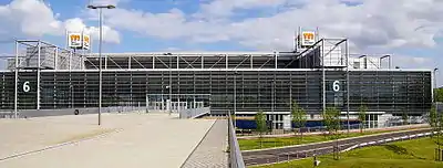 The Messe Düsseldorf is a trade fair ground and organizer, based in Düsseldorf, Germany. With a workforce of 1,459 employees worldwide (2006) and a total exhibition space of 306,000 m2 (of which 262,700 m2 is indoors) in Düsseldorf,[1] the company is one of the largest in the industry. More than 40 annual fairs are staged at the premises in Düsseldorf, including 23 leading events in their respective sectors.