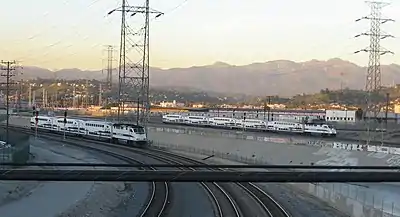 Metrolink (reporting mark SCAX) is a commuter rail system in Southern California, serving Los Angeles, Orange, Riverside, San Bernardino, and Ventura counties, as well as to Oceanside in San Diego County.[8][9] The system consists of eight lines and 69 stations operating on 545.6 miles (878.1 km) of track.[7] Arrow is operated under a contract with the San Bernardino County Transportation Authority (SBCTA).[6]